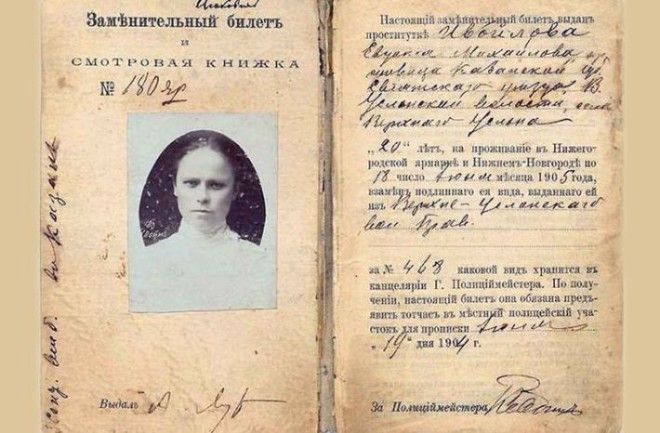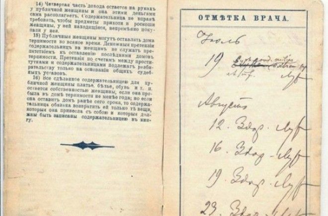 По введенным правилам труженицам борделей выдавался так называемый “Заменительный билет” вместо паспорта. Из-за своего цвета в народе документ именовался “Желтым билетом”, а его владелицы были обязаны регулярно проходить медосмотр и ходить в баню.