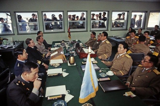 Переговоры между Северной и Южной Кореей ведутся за столом, который стоит на линии DMZ (демилитаризованной зоны), - Пханмунджом (Деревня в Северной Корее) 1983 год