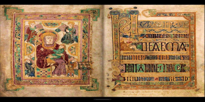 Она была написана в 800-м году монахами монастыря Святой Колумбы, поэтому иногда ее называют еще Книгой Святой Колумбы. Дата написания — ориентировочная, конечно, плюс-минус пару десятков лет. Она содержит четыре Евангелия, украшена изумительными иллюстрациями из жизнеописания Христа, Марии и евангелистов. Страшная редкость и ценность, одним словом. На страницах — пустого места нет, на каждом миллиметре — вензеля, орнамент… Впрочем, сами смотрите. Фотографировать в зале, где хранится книга, строжайше запрещено, поэтому фотографии пришлось взять из интернета.