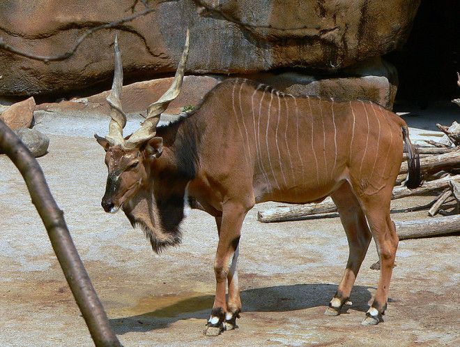 Это самая большая антилопа в мире. Обитает в Африке. Ее также называют «лордом Дерби» в честь английского графа Эдварда Смита-Стэнли. Спиралевидные рога животного могут достигать 290 см в длину.