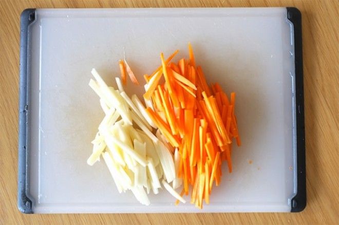 - Очистите картофель и морковь, нарежьте тонкой соломкой.
