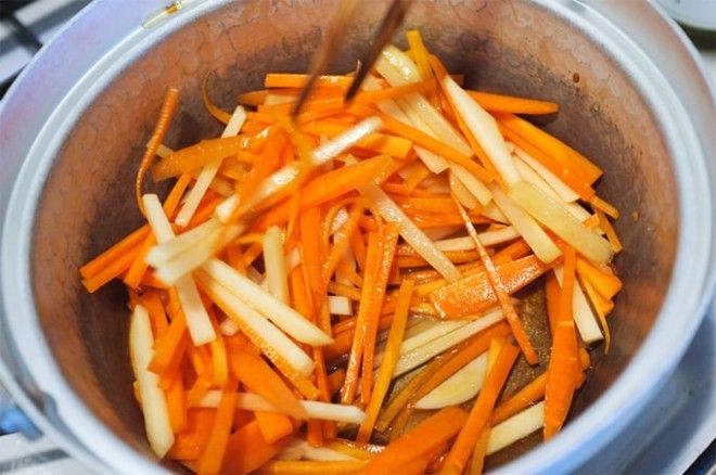 - Слегка обжарьте картофель и морковь на несильном огне в кунжутном масле.