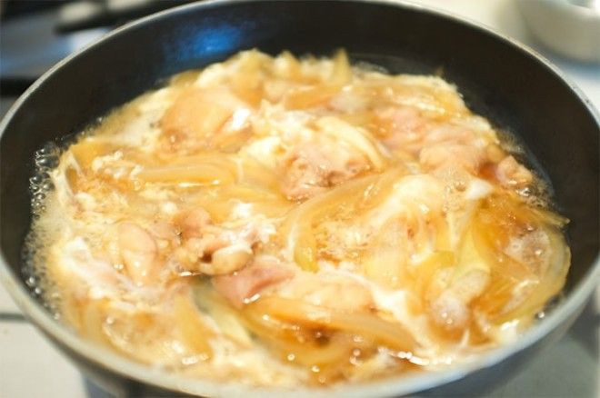 - Чтобы оякодон вышел красивым, белки и желтки вливают по отдельности и варят разное время, благодаря чему желтки получаются полужидкими. Если же нет времени разделять, можно вливать и всё сразу.