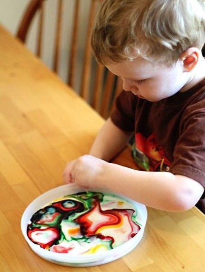 Ход действий. Налей молоко в тарелку, затем добавь по пару капель пищевых красителей разных цветов. Возьми ватную палочку, обмакни ее в жидкое мыло или моющее средство. Коснись кончиком палочки поверхности молока. Ты заметишь, как станет происходить нечто невообразимое — молоко начнет двигаться, переливаться и играть красками.