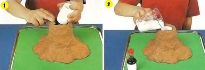 Ход действий. Слепи с помощью глины или песка вулкан. В качестве формы, вокруг которой ты будешь делать лепку, используй пластиковую бутылку. Чтобы началось «извержение», насыпь в бутылку 2 столовые ложки пищевой соды, налей 1/4 стакана теплой воды, насыпь пищевого красителя, а затем добавь 1/4 стакана уксуса.