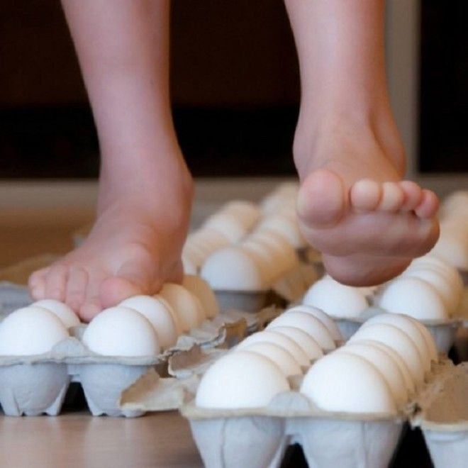 Ход действий. Застели пол мусорными мешками и поставь на них 2 лотка с яйцами. Яйца должны быть повернуты острыми или тупыми концами в одну сторону. Если правильно поставить ногу и распределить равномерно вес, то ты даже сможешь в прямом смысле походить по яйцам, не повредив при этом ни одного. Не веришь? Попробуй вместе с малышом!