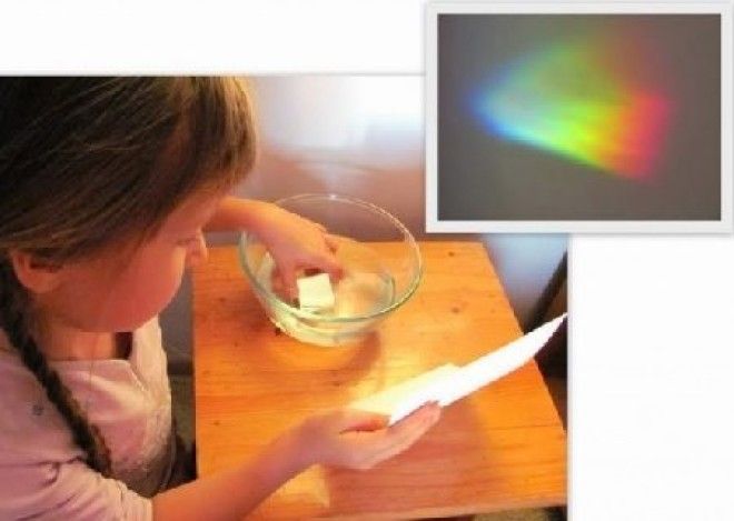 Ход действий. Налей в тарелку воды и положи на ее дно зеркальце. Посвети на зеркальце фонариком. Попробуй поймать отраженный свет листочком бумаги, на котором должна появиться радуга.