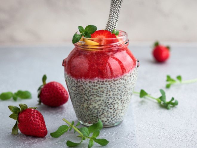 Плавно переходим к более неожиданным сочетаниям. Кокосовое молоко послужит отличной заменой обычному и придаст интересный вкусовой оттенок, а семена чиа сделают смузи еще более полезным.