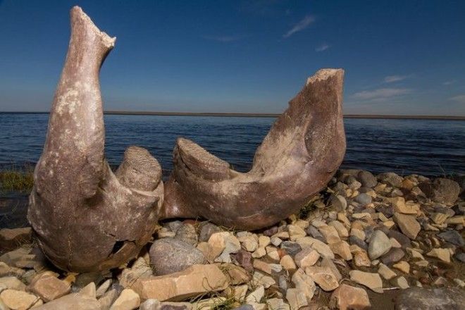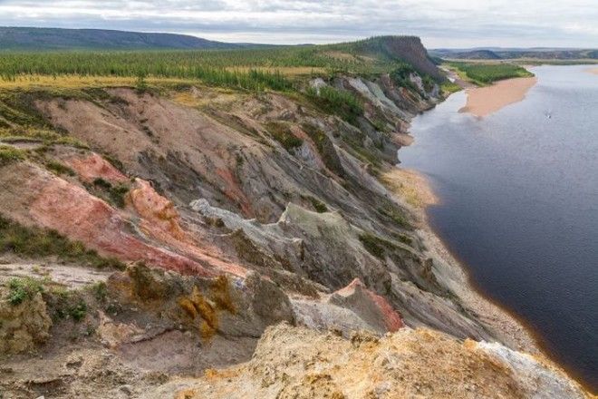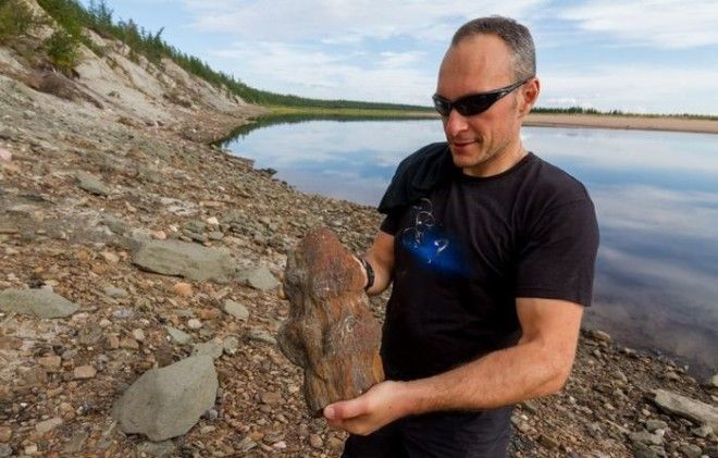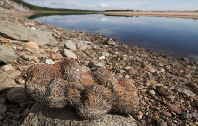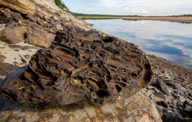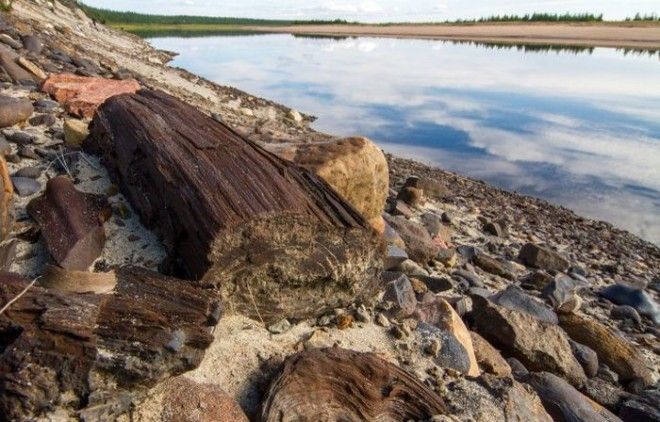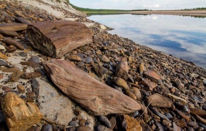 Каменный лес на берегу Попигая. Выглядит очень необычно. То здесь, то там по берегу разбросаны стволы деревьев, ветки, щепки. Из обрыва реки торчат целые пни. Но всё каменное. Минералы, заместившие растительную органику, на десятки и сотни миллионов лет сохранили структуру деревьев, произраставших некогда здесь.