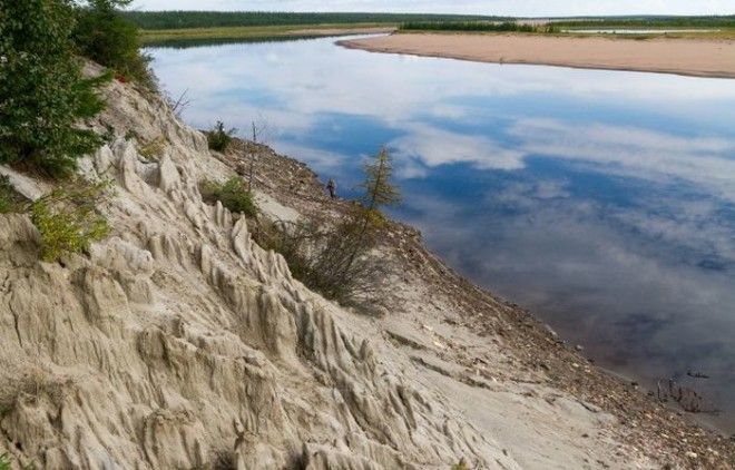 Изредка по берегу встречаются места вытаивания линз ископаемого льда.
