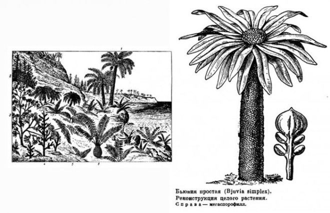 Среди окаменелых остатков деревьев близких по структуре к хвойным, встречаются остатки пальм - саговников.