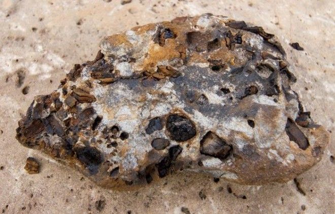 Куски ракушечника с остатками древних раковин находятся вместе с окаменевшими стволами мезозойских деревьев и выходами каменного угля - тоже по сути мегабрекчия, или конгломерат различных по времени происхождения, составу и залеганию пород, оказавшихся перемешанными в результате падения астероида.
