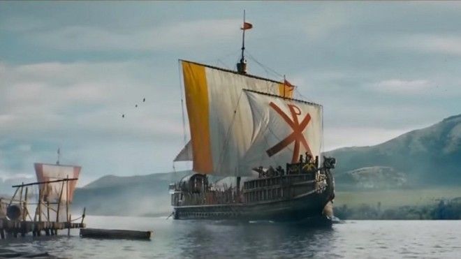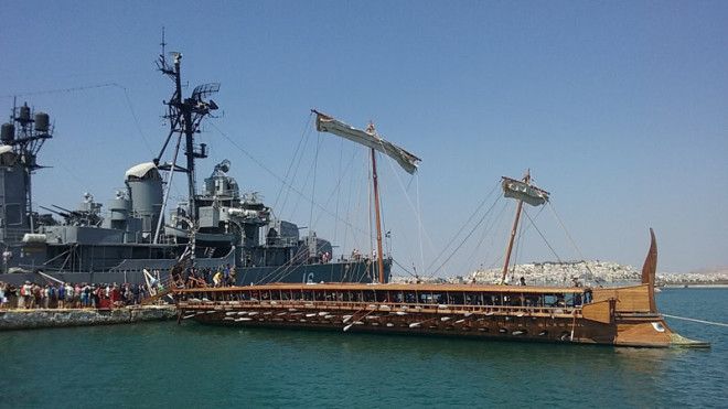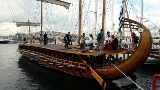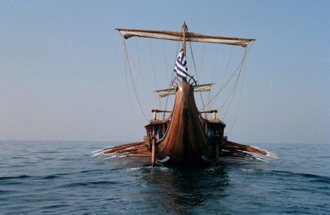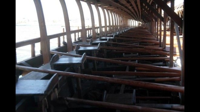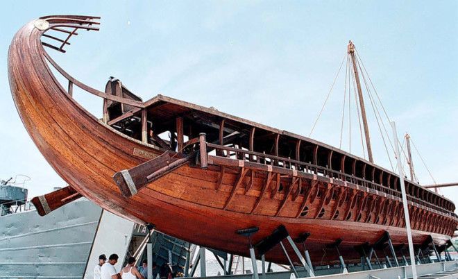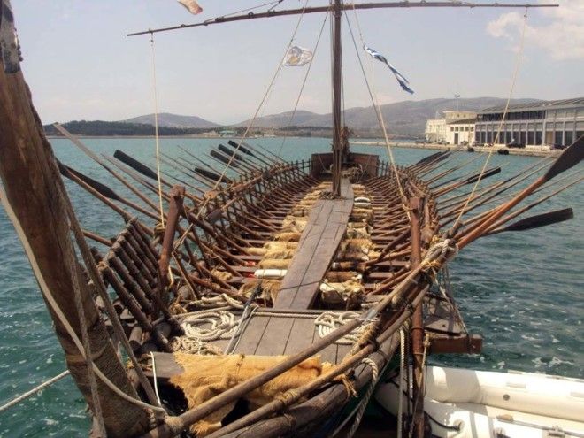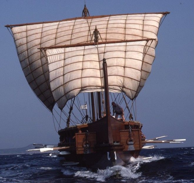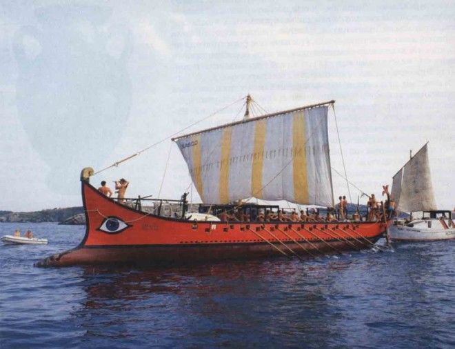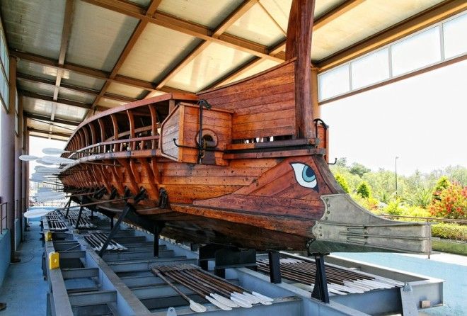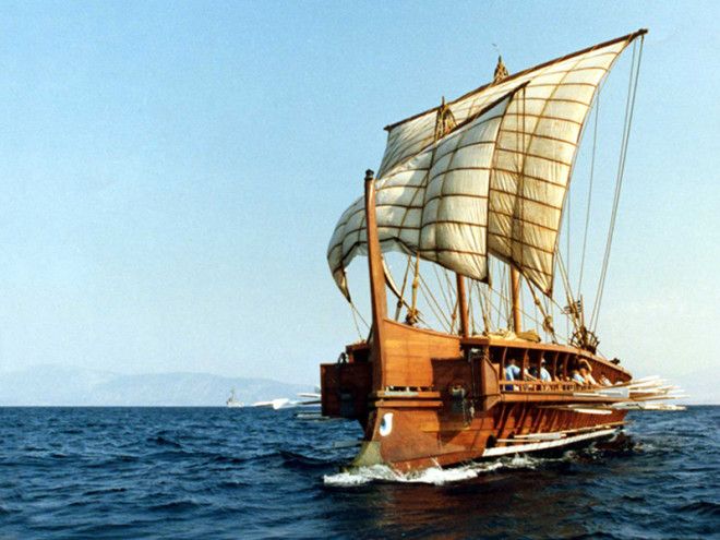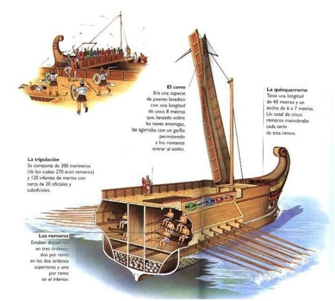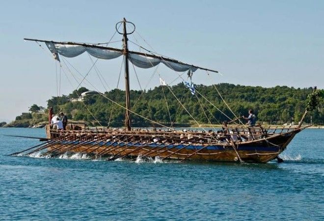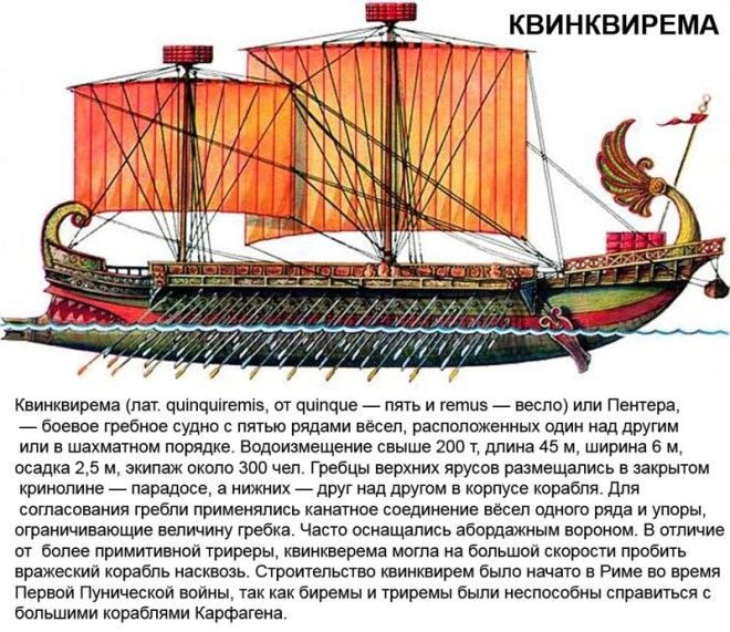 Тут доподлинно известно, что сии броненосцы представляли собой боевой корабль с тремя рядами вёсел, на двух вёслах сидело по два гребца, на одном – один, всего пять. Расположение в пять рядов никто уже просто в здравом уме не рассматривает. Число весел в одном ряду доходило до 25, водоизмещение свыше 200 т, длина 45 м, ширина 6 м, осадка 2,5 м, экипаж около 250 чел. Для согласования гребли применялись канатное соединение вёсел одного ряда и упоры, ограничивающие величину гребка. Вооружались аж восемью камнемётами, имели по 300 морпехов и их построили в разных модификациях 500 шт. Такие посудины просто переезжали судно противника, у них даже не было тарана – жуткая штуковина.