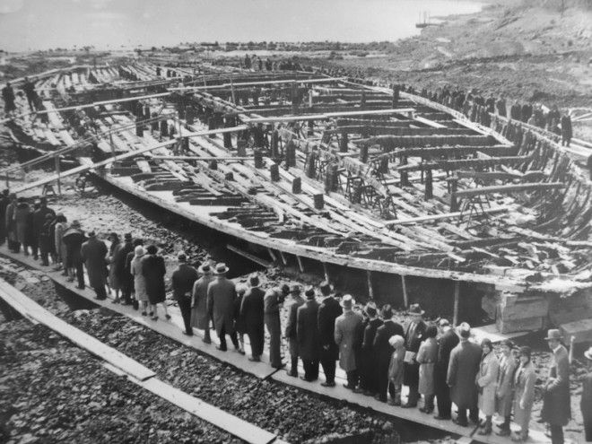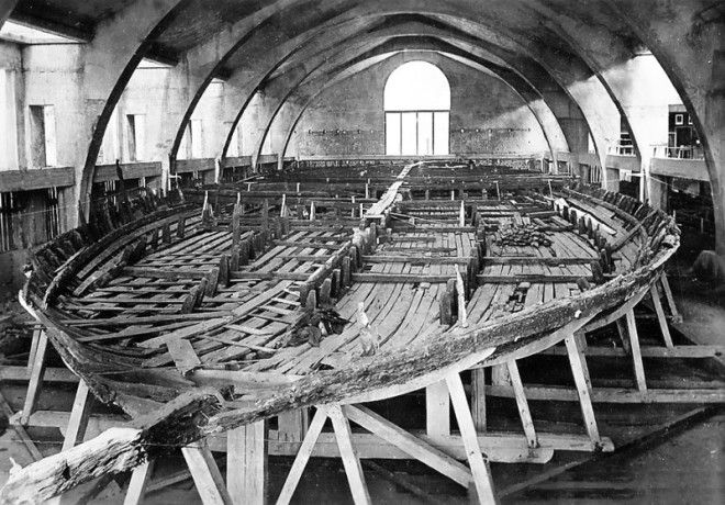 Для тех, кто скажет: «они же НЕ МОГЛИ такое построить», приведу фото. Это так называемые корабли озера Неми 37—54 гг. постройки, принадлежавшие небезызвестному Калигуле, утопленные Нероном и обнаруженные в 1444 году ныряльщиками кардинала Просперо Колонна. Тогда их поднять не смогли, к счастью может быть, но подняли при Муссолини в 30-х, а потом сожгли в 1944 году (сволочи, ни себе, не людям). Посудины по 70 и 73 м в длину и по 20 м в ширину, примерно 300 т. водоизмещением. Там имелось масса всяческих роскошеств, включая корабельный водопровод и был обнаружен подшипник, правда использовался он для поворота скульптур и для прочего баловства. Так, что Антикитерский механизм не такое уж чудо для греческих, египетских и римских инженеров, судя по всему это был обычный астрономический прибор или вроде того.