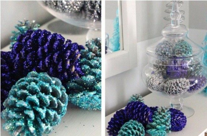 Также очень часто шишки обсыпают разными блестками. Для этого по поверхности шишки надо пройтись кисточкой с клеем, а затем обсыпать шишку на свой творческих вкус и лад.
