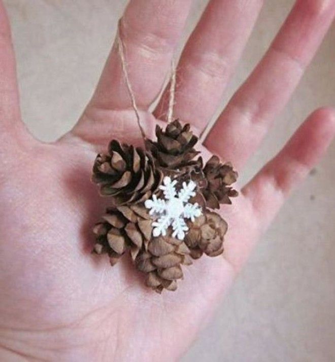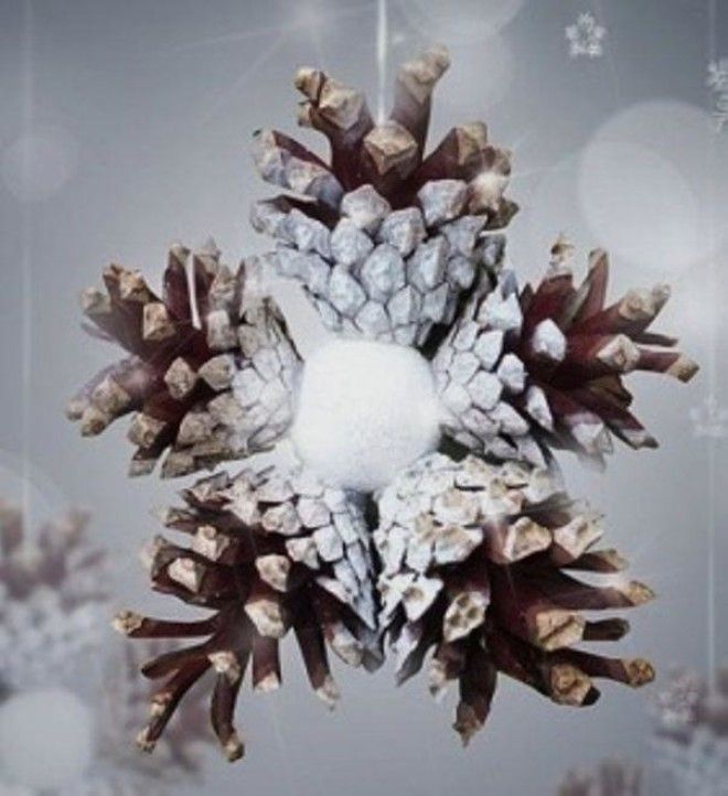 А еще ведь можно при помощи клея собрать из шишек снежинку! Ух, полет фантазии! Из маленьких шишек и снежинки маленькие, а вот если взять шишки большие, то это уже не просто снежинка-гигант, а еще и шикарное украшение для входной двери (конкуренция венкам обеспечена).