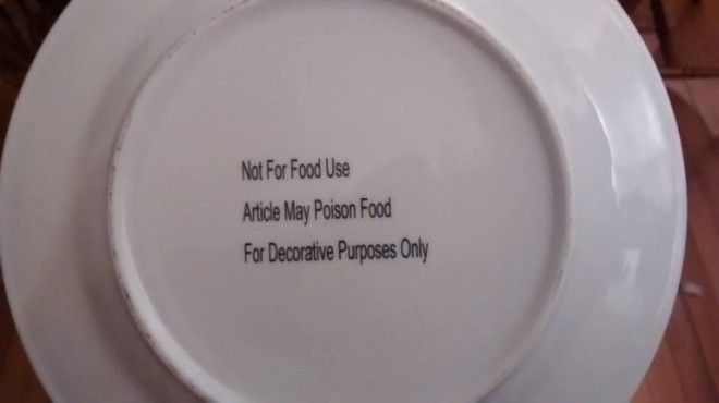 "После того, как мы съели печенье, которое соседи принесли нам в подарок, мы обнаружили на тарелке эту надпись". (Надпись на тарелке: "Не для пищевых продуктов, только для декоративных целей, в еду может попасть яд").