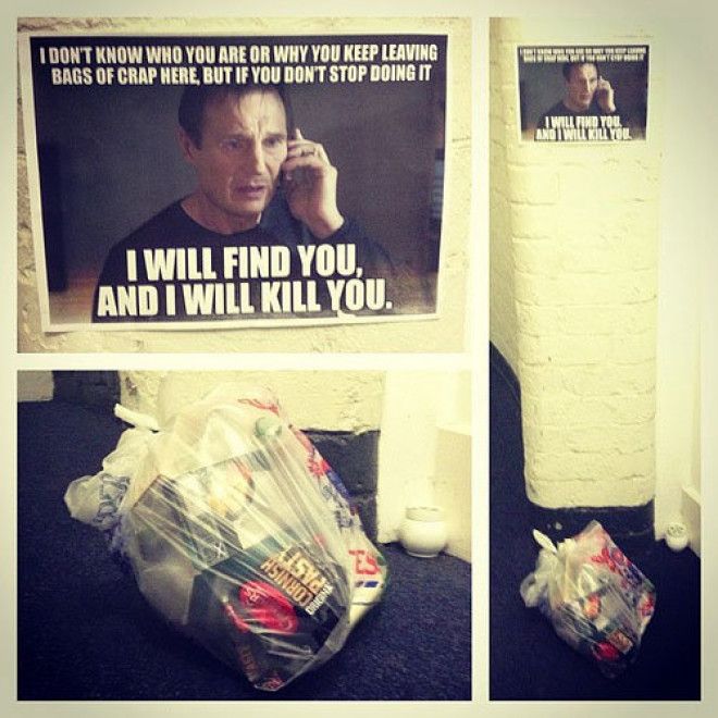 "Я не знаю, кто ты и почему оставляешь здесь мешки с мусором. Но знаешь что - заканчивай с этим. Иначе Я ТЕБЯ НАЙДУ И Я ТЕБЯ УБЬЮ!"