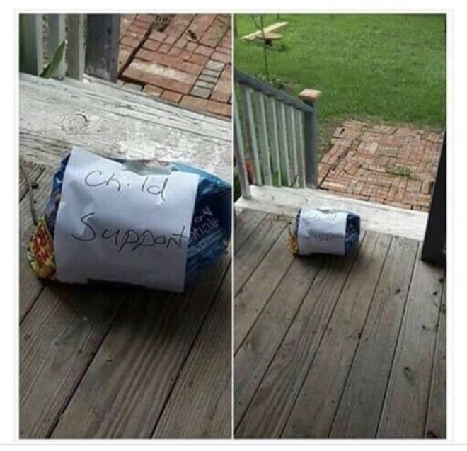 "Моя кошка забеременела от соседского кота. Через некоторое время однажды утром я обнаружил на крыльце вот это" (надпись на пакете: "Алименты").