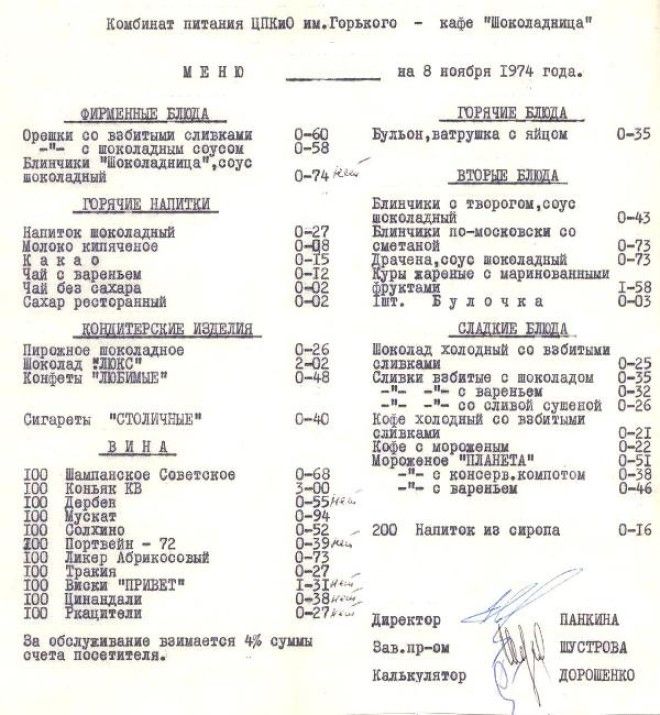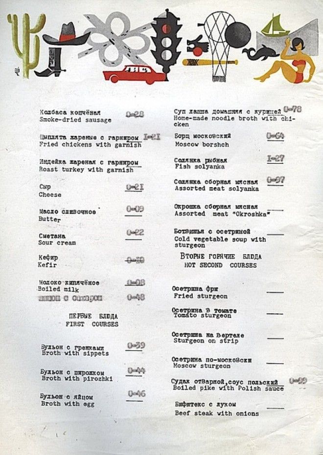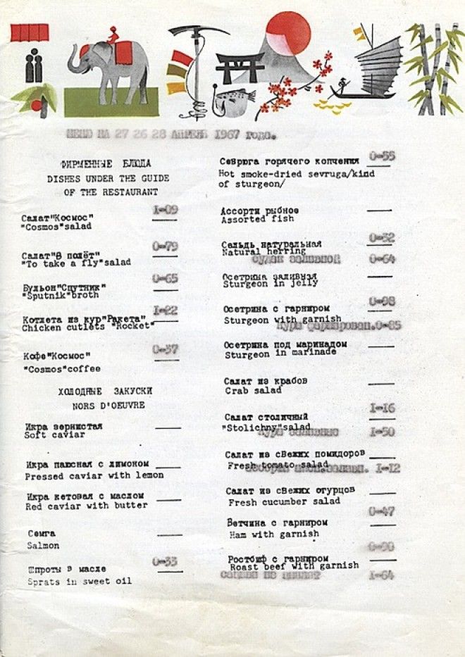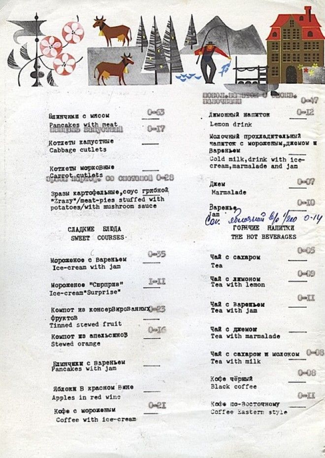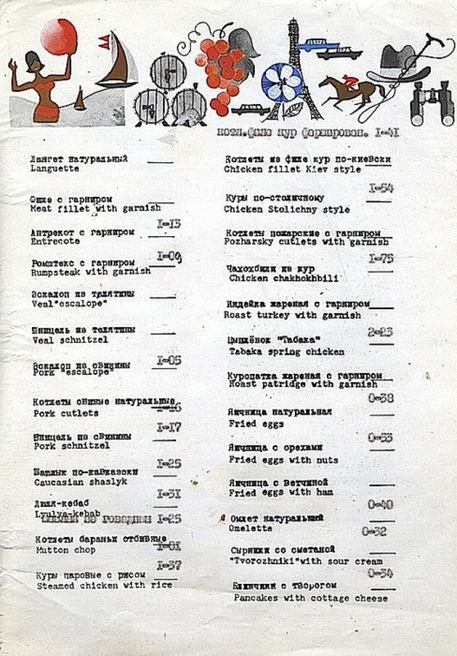 Или вспомните смесь спеси и снисхождения, с которой «блатные» официанты умели ставить клиентов на место: «Телячьей вырезки на гриле нет, только шницель!» Но первая любовь есть первая любовь, и сегодня мы с умилением вспоминаем подробности наших походов «по кабакам», как тайком доливали в графинчики принесенную с собой водочку, как робко приглашали барышень на «медляки». И конечно, с особым умилением мы вспоминаем тогдашние цены советского общепита. Ах, какие тогда были цены!