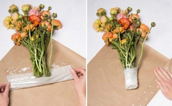 13. Чтобы букет без воды дольше выглядел свежим, используй эту хитрость. Обмотай концы стеблей мокрой тканевой салфеткой, затем плотно оберни пленкой.