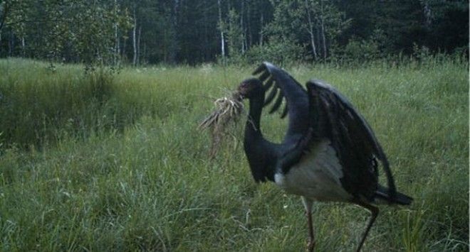 Занесенный в Красную книгу черный аист со стройматериалами для гнезда.