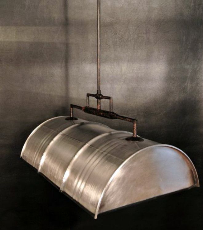 С помощью пары лампочек и половинки металлического бочонка можно изготовить очень эффектный светильник, который идеально подойдет к интерьеру комнаты, оформленной в стиле индастриал.