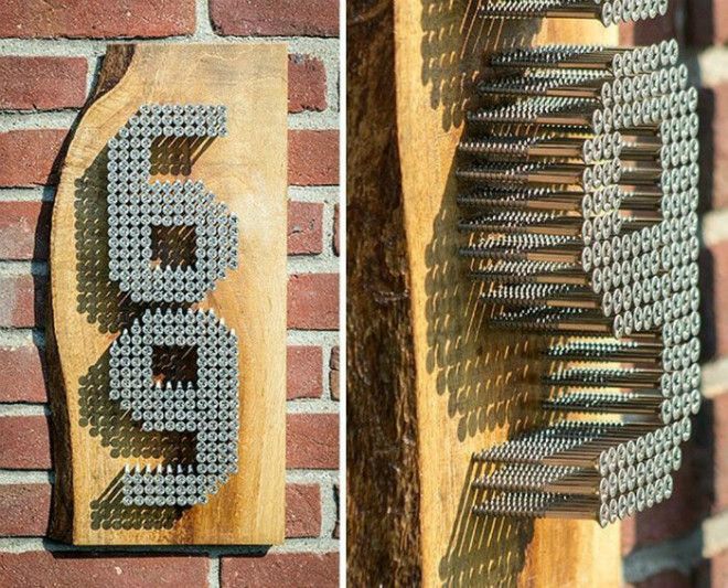 Такую табличку сложно отнести к одной из главных деталей дома, но она, несомненно, может стать его важной частью. А это ли не повод сделать ее красивее и оригинальнее? Для воплощения подобной идеи в жизнь вам потребуется маленький кусочек дерева или фанеры, а также молоток и гвозди. Все просто: для начала вам необходимо будет нарисовать на куске древесины номер дома, а затем – забить цифры гвоздями.