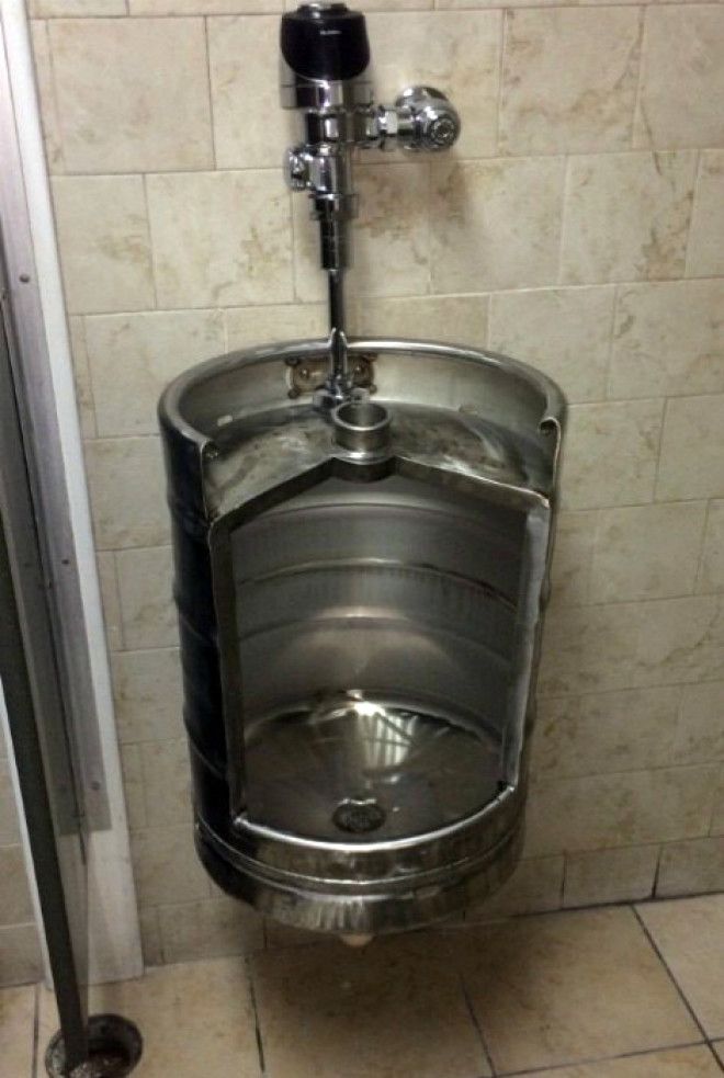 Бочонок из металла может легко превратиться в оригинальный писсуар. Он оптимально подойдет для мужского туалета, размещенного в каком-либо из оформленных в индустриальном стиле заведений.