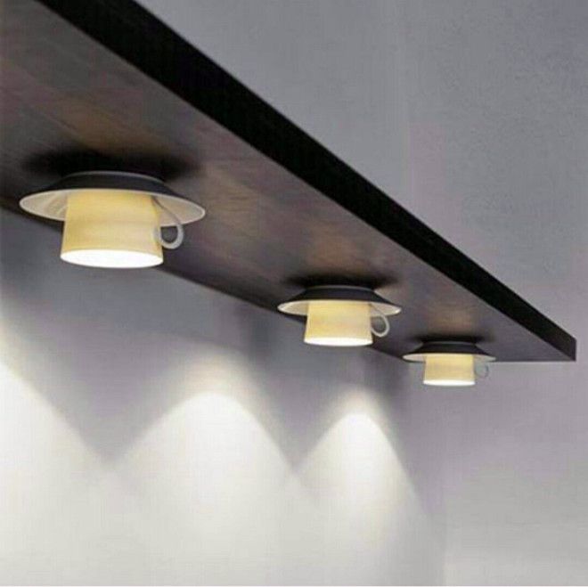 Очень интересный светильник можно изготовить из пары лампочек, древесной планки и нескольких одинаковых или очень похожих друг на друга чашечек с блюдцами. Прикреплять его следует внизу кухонного шкафчика – таким образом, вы получите необычную локальную подсветку.