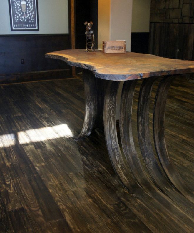 Такой столик словно сливается с полом, буквально вырастая из него из-за своих ножек, материалом к изготовлению которых стали паркетные дощечки, прикрепляемые к поверхности пола с аналогичным цветом. Деревянная столешница придает подобному столику дополнительную стильность.