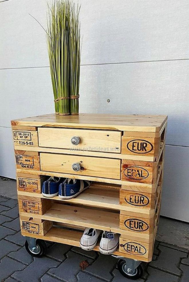 Из европоддона вы сможете смастерить не только практичный, но и симпатичный миниатюрный обувной шкаф. Он станет отличным дополнением прихожей в стиле лофт.