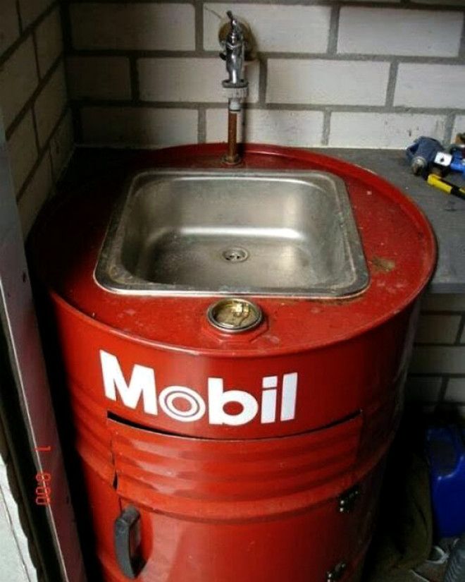 Материалом для изготовления тумбы стала металлическая бочка. Придавая оригинальности обрамлению раковины, тумба станет гармоничным дополнением комнаты, выдержанной в стиле лофт.