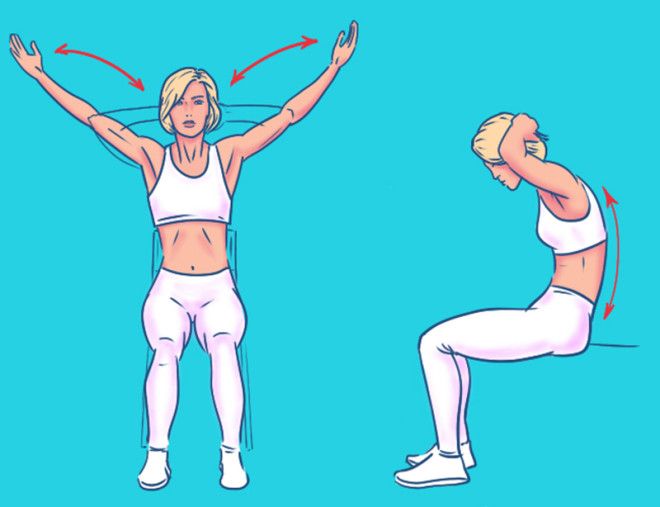Эффект: разгоняет кровь после долгого сидячего положения, растягивает боковые мышцы и мышцы грудной клетки.