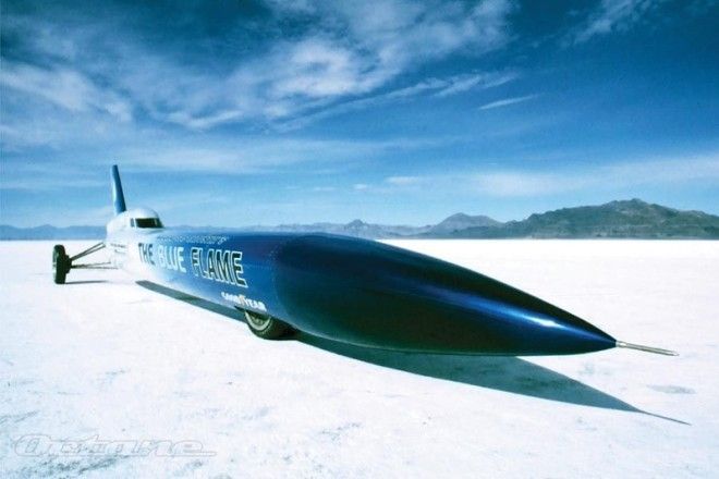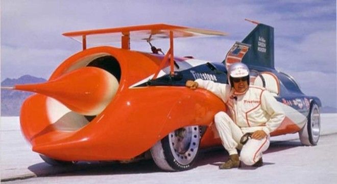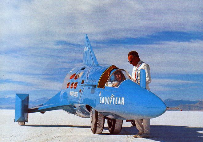 58. Но прогресс неумолим, и мощные авиационные турбореактивные двигатели тоже начали немножко отставать. 23 октября 1970 года, после пятилетнего перерыва, был установлен пятьдесят восьмой рекорд скорости для автомобиля. Это сделал пилот Гэри Гэбелич (Gary Gabelich) на автомобиле The Blue Flame — первый рекордным автомобилем с ракетным двигателем; он первым пробил барьер в 1000 км/ч, разогнавшись до скорости 1014, 52 км/ч.