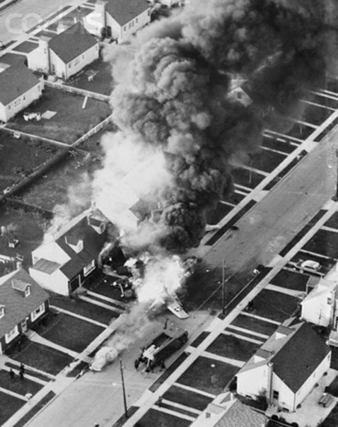 Первое фото, сделанное при помощи аэросъемки. Пилоты бомбардировщика до последнего пытались увести падающий самолет от жилых домой. Только они двое и стали жертвами катастрофы.