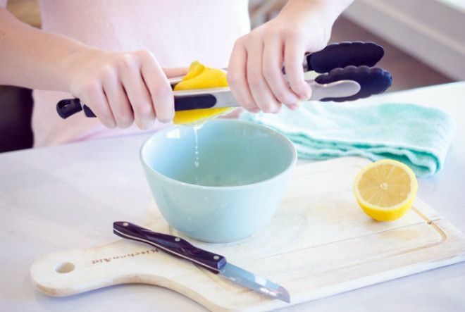 Если под рукой нет хотя бы чашки-соковыжималки, добыча лимонного сока становится испытанием – большая часть продукта льется на руки, а не в блюдо. Если параллельное отбеливание кожи и укрепление ногтей лимонным соком не входит в ваши планы, попробуйте выжать половинку лимона, зажав ее в кухонных щипцах. Дело сделано, и руки чистые и сухие.