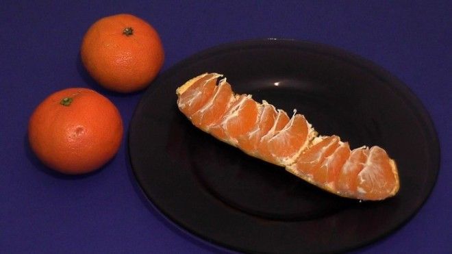 Кто не хотел, чтобы мандаринку или апельсин почистили за него? Но есть еще один способ насладиться оранжевыми цитрусами, не испачкав рук. Достаточно срезать кожуру сверху и снизу, потом сделать неглубокий продольный надрез и разорвать кольцо – дольки останутся аккуратно лежать на полоске кожуры. Остается только взять и съесть их.