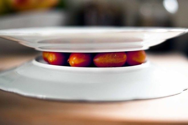 Томаты-черри так хороши в салатах или канапе, но разрезать их в промышленных масштабах – какая-то пытка. Расправиться с ними разом можно, положив их между двух тарелок или пластиковых крышек, надежно зафиксировав и сделав один разрез. Вуаля, бон аппети!