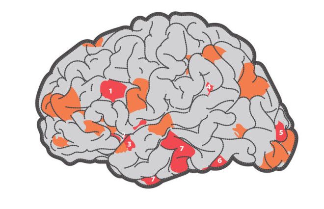Области мозга, демонстрирующие повышенную активность в периоды романтической любви (показаны ярко-красным) и материнства (розовые)*. Цифрами отмечены: (1) дорсолатеральные участки средней лобной извилины, (2) островок, (3) верхняя височная извилина, (4) угловая извилина в задней части теменной доли, (5) кора затылочной доли и (6) затылочно-височной извилины, (7) вентральные височные участки. Не видны расположенные глубже активные структуры, включая прецентральную извилину, таламус, гиппокамп, хвостатое ядро и т. д.*