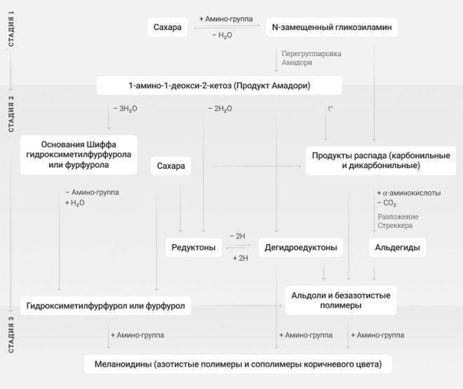 В учебниках пишут, что реакция Майяра состоит во взаимодействии аминокислот и редуцирующих сахаров. Не все так просто. Это лишь начало процесса. Самое интересное и настоящий химический хаос остается обычно за кадром. Продукты взаимодействия претерпевают перегруппировки, распады, реагируют между собой и другими продуктами реакции, потом снова реагируют и распадаются, и снова реагируют. Характер промежуточных и конечных продуктов процесса, скорость, направление отдельных реакций внутри него зависят от множества различных факторов: состава исходной «среды», кислотности, влажности, температуры, перемешивания и т. п. Памятник можно ставить химикам, которые смогли разобраться в этом.