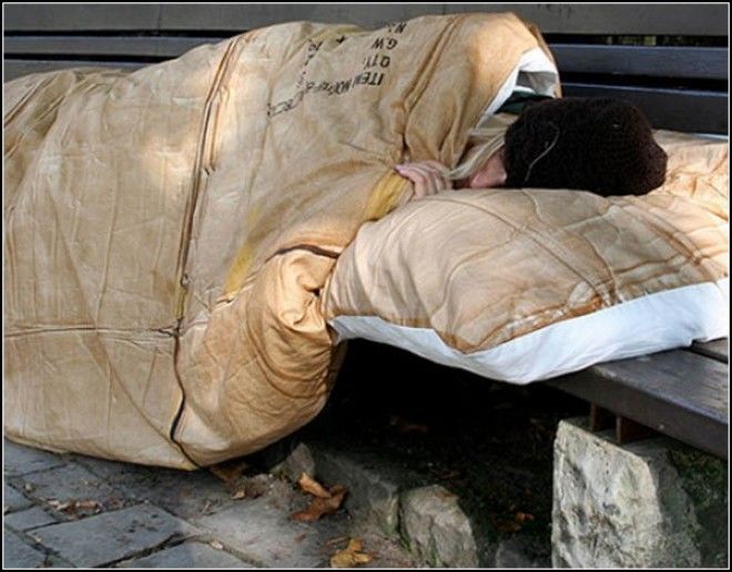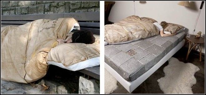 Постельный комплект Homeless Bedding – продукт поистине творческого мышления. Спать вам придется на жестких тротуарных плитах. Одеялом и подушкой послужат картонные коробки из-под бытовой техники. Именно так выглядят входящие в комплект предметы. Ключевое слово – «выглядят», потому что все это не более чем фантазийный декор.