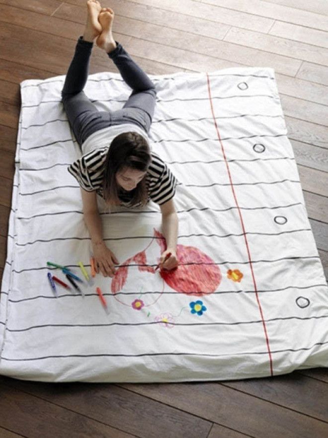 Представьте школьную тетрадь, которая внезапно превратилась в постельное белье. Именно так выглядит комплект от Doodle by Stitch. К нему можно дополнительно приобрести разноцветные маркеры, предназначенные для рисования по ткани. Рисовать по белоснежной разлинованной простыне – одно удовольствие, а водорастворимая краска фломастеров позволит получать после каждой стирки идеально чистое белье, готовое к новым художественным экспериментам.