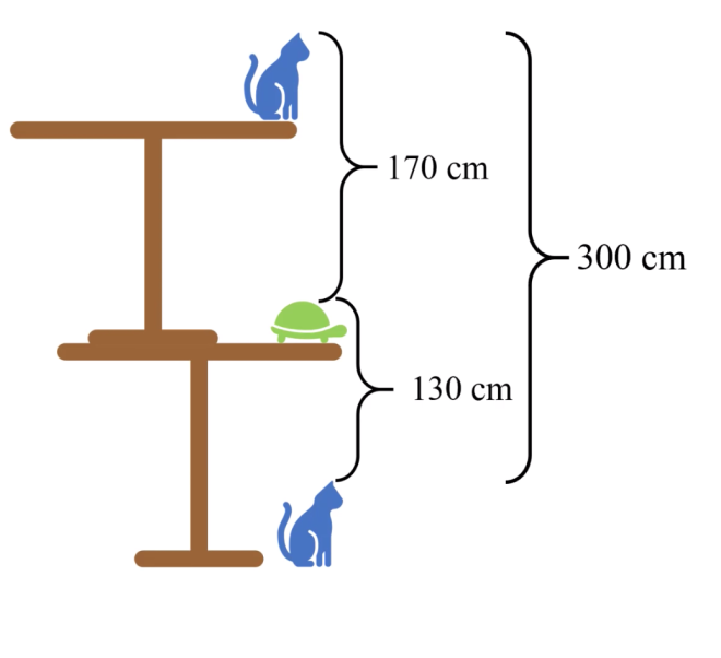 Задание звучит следующим образом: «Найдите высоту стола, зная, что расстояние между головой кота на столе и головой черепахи на земле составляет 170 см, а расстояние между головой черепахи на столе и головой кота на земле составляет 130 см».