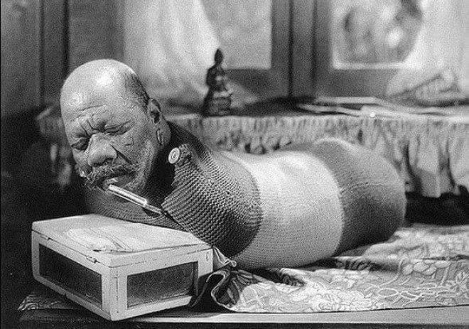 «Человек-гусеница» родился без единой конечности. На потеху толпе он скручивал сигареты ртом.