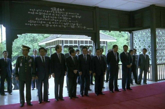 Южнокорейские официальные лица собрались у мавзолея мучеников в Мьянме за несколько секунд до взрыва бомбы, установленной северокорейскими шпионами, убившей 21 человека - 1983 год.