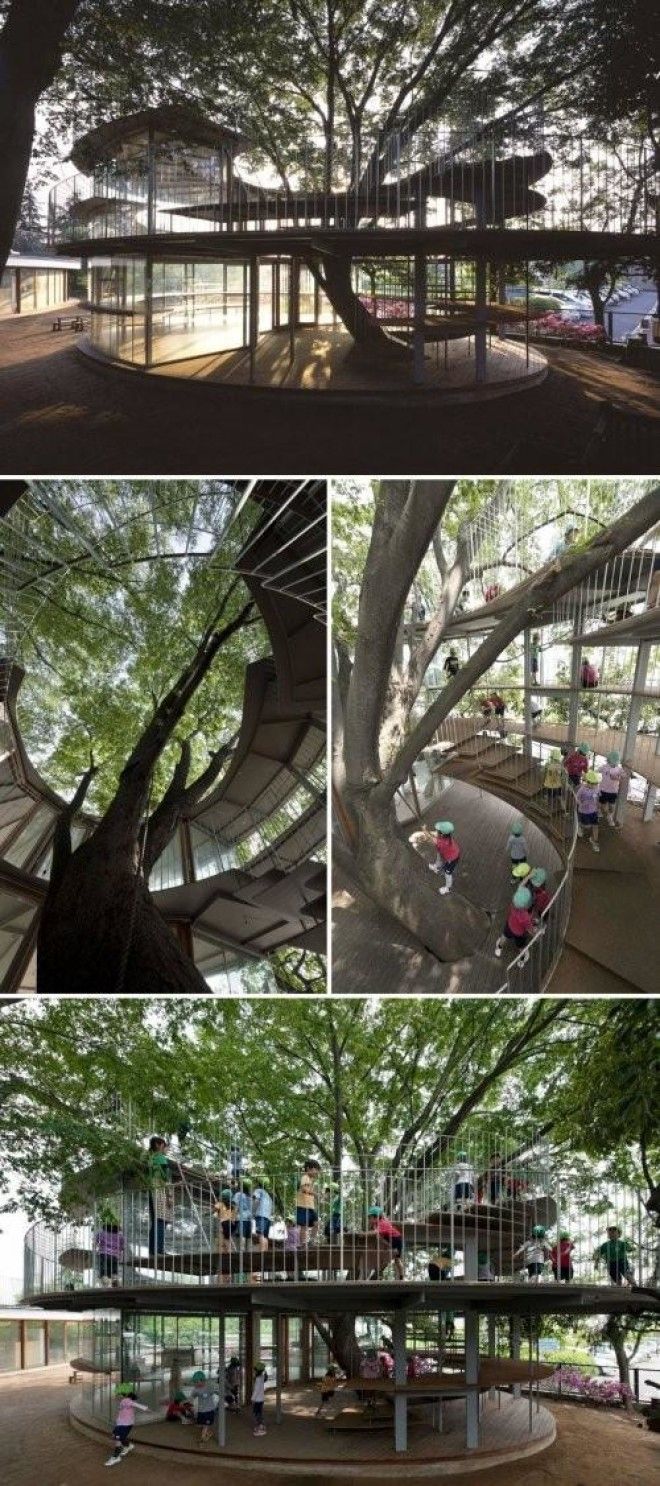 Игровая площадка детского сада, построенная вокруг дерева