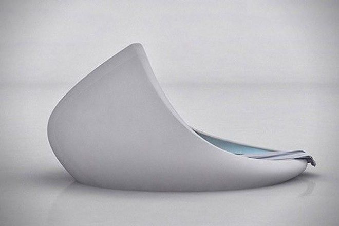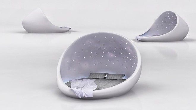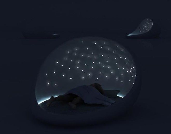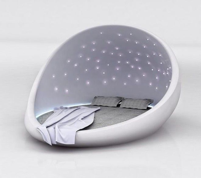 Дизайнер из Санкт-Петербурга Наталья Румянцева создала кровать, пока еще в стадии прототипа, из белого стекловолокна. Обозначая контур неправильного овала, светодиодные фонари расцвечивают светящимися точками изогнутую крышу над матрасом, у которого регулируется угол наклона. Встроенная аудио-система воспроизводит музыку или белый шум, а также может программироваться в качестве будильника. “Распылитель ароматов”, как описывает его на своем сайте Румянцева, источает целебные запахи.