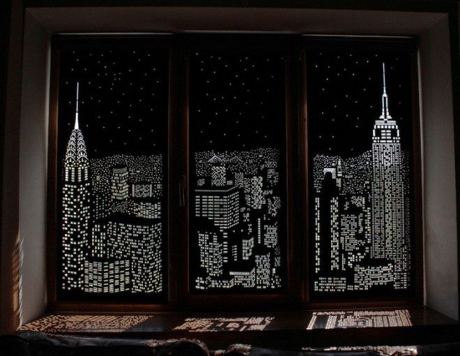 9. Современные затемняющие шторы, имитирующие вид на ночной мегаполис